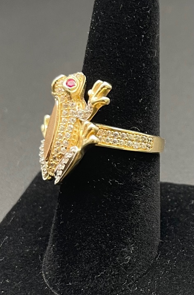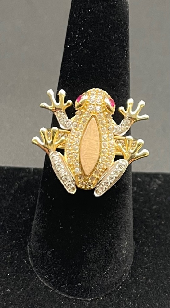 Yellow Gold 14kt Yellow 6.30gms Ring Sz:8 14kt gold frog ring w/ clear and pink stones